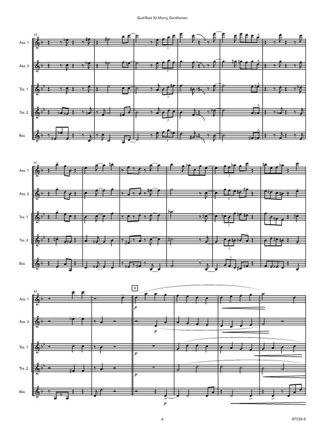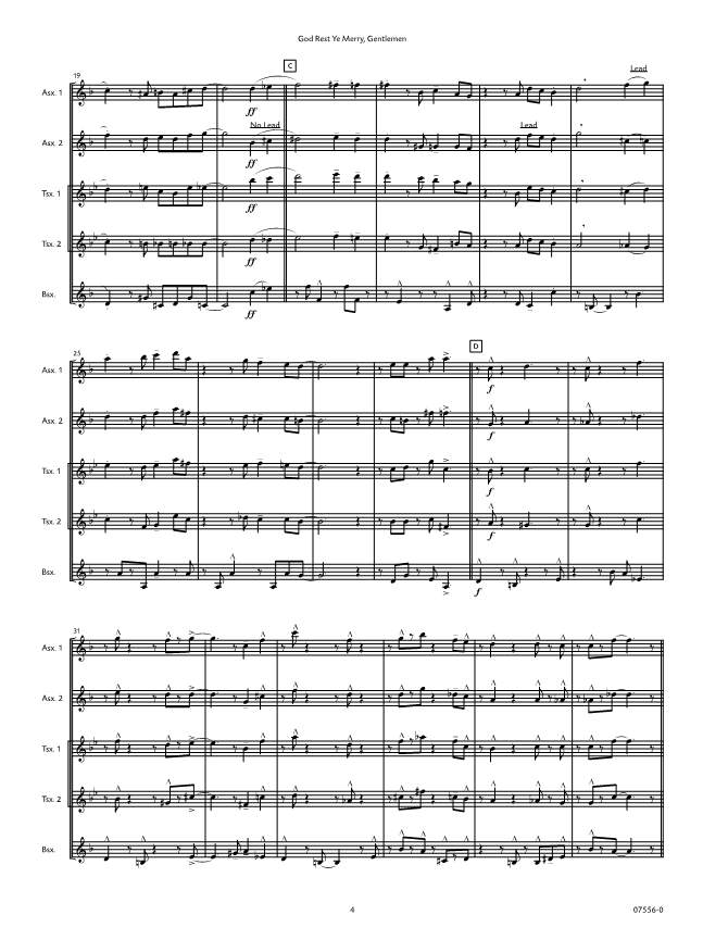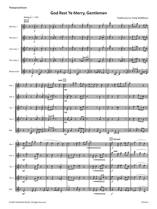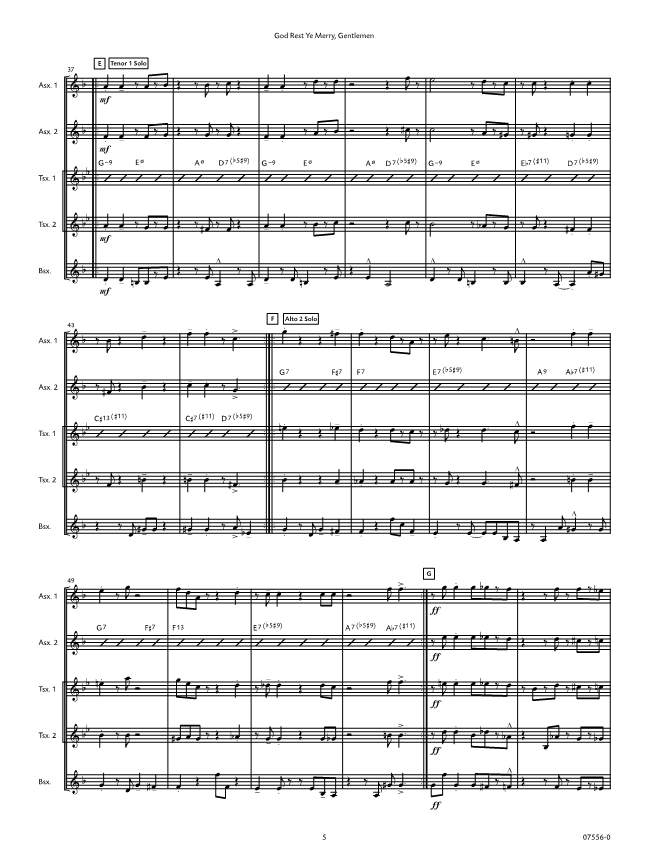 Playing jazz versions of Christmas music has always been a joy for me, and I arranged this version of the English carol God Rest Ye Merry, Gentlemen to reflect the way I have performed this with a jazz quartet. Written for saxophone quintet (2 altos, 2 tenors and baritone), this piece combines syncopated swing and latin-jazz rhythmic phrases, modern jazz harmony and just a bit of old-fashioned counterpoint with solos for Alto and Tenor sax. Duration is between 3 1/2 and 4 minutes with a medium level of difficulty.